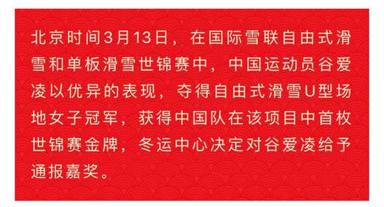 在这次夺金后的第一时间,国家体育总局冬季运动管理中心也向谷爱凌给予了通报嘉奖。