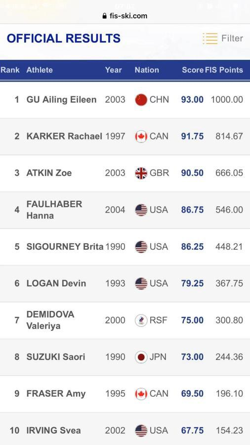 决赛中,她首轮便用几乎完美的表现,让六位裁判均打出90分以上高分,最终拿到93.00分。接下来的第二轮,她也拿到了92.5的高分,这也是全场的第二高分。最终夺得亚军加拿大选手卡尔特克的银牌成绩,也仅为91.75。谷爱凌此战的统治力可见一斑。