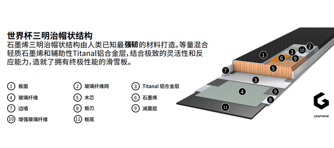 HEAD 2022中国限定款滑雪板内置11层结构,其出色的性能内置于雪板的每一层和每个部分,石墨烯世界杯三明治帽状结构由人类已知最强韧的材料打造,利用石墨烯轻便、超强的导电性与辅助性Titanal铝合金层的抗扭转能力、减震性能,结合极致的灵活性与反应能力,提供极佳的敏感度和出色的力传递,从而带来极致的比赛表现。