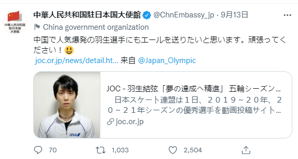 中国驻日大使馆在转发中写道:“我们也想给在中国有巨大人气的羽生选手加油。”