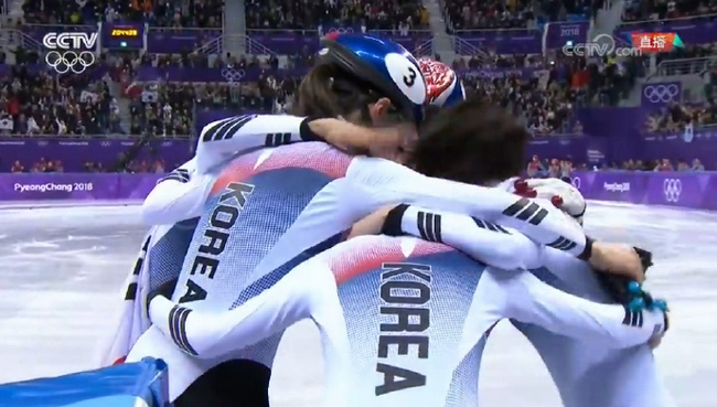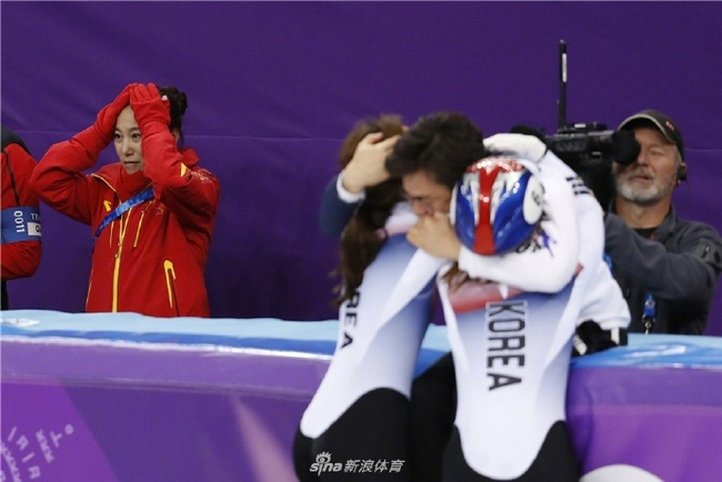 而当裁判韩国夺冠后,四名韩国选手还在冰上流泪进行了拥抱。