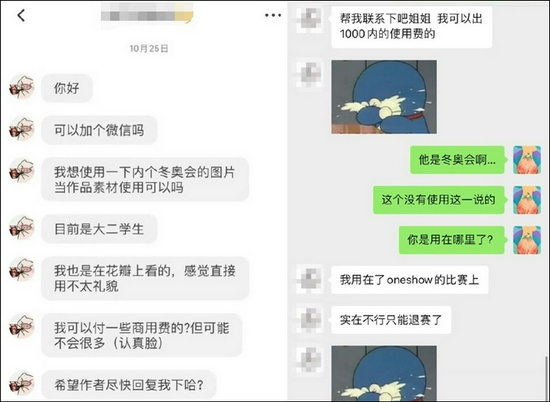 @树一Treeeonee 透露,其实在截稿前,也就是10月25日,涉事学生就曾联系过她,她之后告诉过对方版权已经卖给冬奥会了,可是该学生称,自己没有拿来商用,只是去参加比赛了,所以想要出1000以内的使用费;