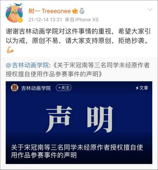昨天中午,吉林动画学院发布针对此事的调查结果称:此事是学生和教师个人行为,10月25日(学生找@树一Treeeonee 了解版权的当日),该校2019级宋冠南、赵淑祺、候传康三位同学私下在网站上找到“2021 ONE SHOW 中华青年创意奖”活动通知,并请动画学院尤鹏惠老师进行指导,虽然在此期间,宋冠南同学向作者提出购买此版权,但未取得原作者的同意,本月8日,宋冠南等三位同学已按原作者要求撤出参赛作品。