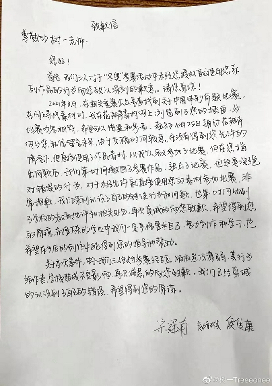 在该声明发布后,@树一Treeeonee 透露,自己已经收到了几名学生的亲笔道歉信,自己也接受了,也希望大家能原谅他们,毕竟他们还是学生,“希望这件事能在他们之后的设计生涯予以警惕,抄袭是万万不可取的,希望他们在未来发展道路上,创作出更好的作品。”