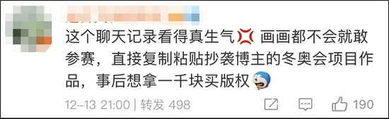 (观察者网讯)近日,插画师@树一Treeeonee 发帖爆料其成功入选冬奥会的设计作品被吉林动画学院几名学生抄袭,后者拿其作品参加比赛还获了奖,更离谱的是,涉事学生其实曾主动联系过她,但并未道歉或主动退赛,只是提出想购买原作品版权,出价1000元。