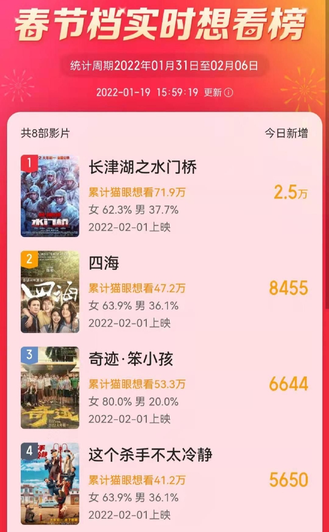 除此之外,易烊千玺的另一部电影《奇迹》,张艺谋、张末父女联合执导的战争片《狙击手》等十多部电影,关注度和期待值都非常高,看这个阵仗今年的春节档可以说是非常热闹了。