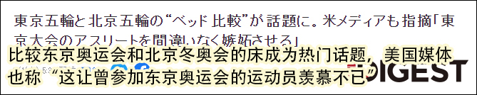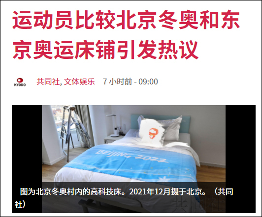 本月1日,日媒The digest发文谈及多个运动员比较北京奥运村的床和东京奥运村的床,其引用美媒的话指出,“这让曾参加东京奥运会的运动员羡慕不已”。