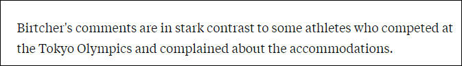 萨默·布里彻的视频引发热议后,多家外媒也进行了跟踪报道,美媒Business Insider、Newsweek等媒体在报道此事时均提到,萨默·布里彻的感受与去年参加东京奥运会并抱怨住宿条件太差的运动员们形成了鲜明的对比。