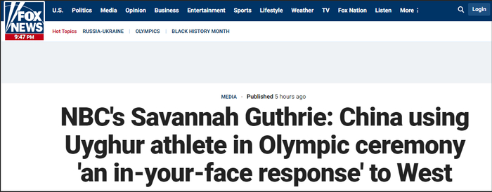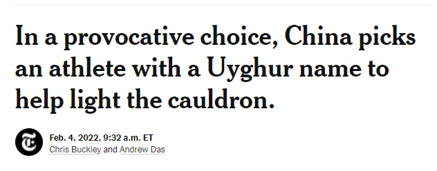 不仅是NBC,对于这位新疆火炬手的出现,《纽约时报》为首的美国媒体更是集体出动,将一场体育赛事的开幕完全政治化,甚至出现新疆姑娘“被迫点火”等谬论。