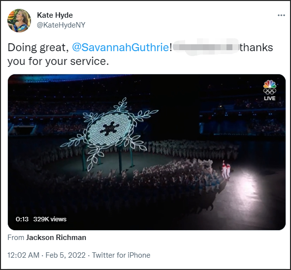 在美国有奥运独家转播权的全国广播公司(NBC)主播萨凡纳·格思里(Savannah Guthrie)在看到新疆姑娘迪妮格尔(和北欧两项运动员赵嘉文一起)安放主火炬时解说道,这一安排是中国“发出的一个声明”、“对于西方国家的‘直面回击’(in-your-face response)——包括美国在内。”