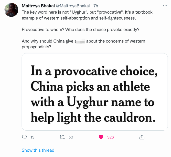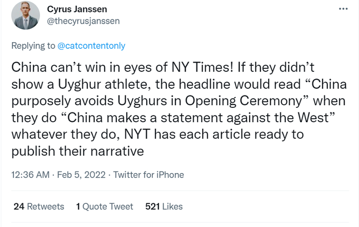 也有人早已看破《纽约时报》的“小心思”:如果开幕式没有维吾尔族运动员,那么《纽约时报》又要说“中国刻意避免让维吾尔族运动员露面”,如果有,那又成了“中国向西方发表声明”,无论如何《纽约时报》都会有自己的议程。