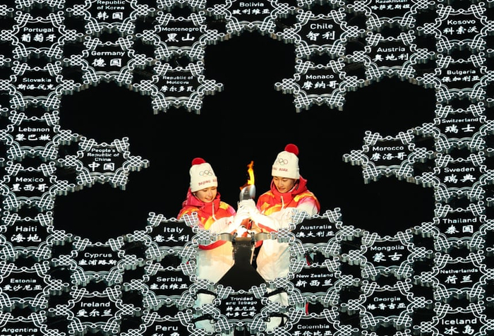 负责将手中的火炬、也是主火炬插在“大雪花”之上的两位年轻运动员,分别是赵嘉文和迪妮格尔·衣拉木江。迪妮格尔——这名来自新疆阿勒泰的越野滑雪运动员,因其维吾尔族身份引起外媒密切关注。
