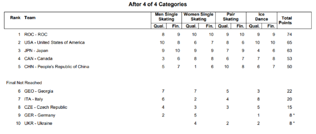 本届冬奥会,中国队凭借金博洋在男单短节目中获得的第六(5分)、王诗玥/柳鑫宇在冰舞韵律舞中获得的第五(6分)、隋文静/韩聪在双人滑短节目中获得的第一(10分)以及朱易在女单短节目中获得的第十(1分),总分拿到22分,以短节目团体第五惊险晋级自由滑,创造了该项目的历史最好成绩。