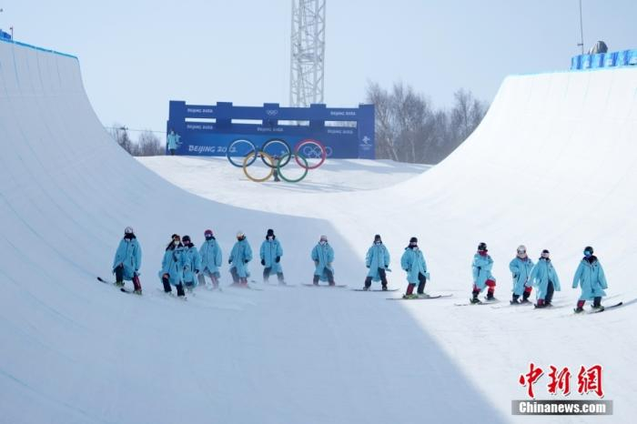 资料图:2月10日,北京2022年冬奥会单板滑雪女子U型场地技巧决赛在张家口云顶滑雪公园进行,图为工作人员在比赛间隙修整场地。 中新社记者 毛建军 摄