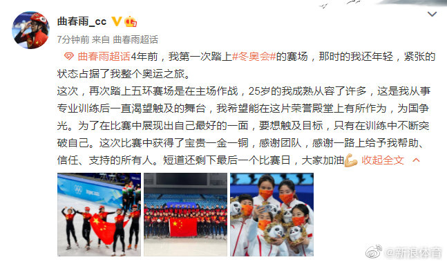 刚刚,中国短道速滑队的曲春雨发布了微博: