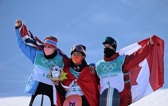 苏翊鸣与其他选手庆祝夺得奖牌