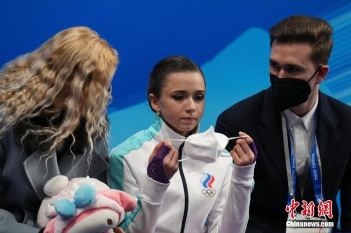 2月15日,北京2022年冬奥会花样滑冰女子单人滑短节目比赛在首都体育馆举行。图为俄罗斯奥委会队选手卡米拉·瓦利耶娃(中)在比赛结束后等待分数。 中新社记者 崔楠 摄