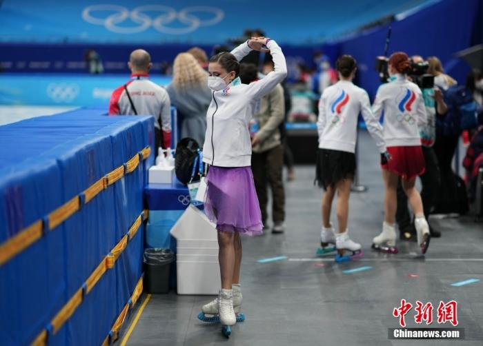 2月15日,北京2022年冬奥会花样滑冰女子单人滑短节目比赛在首都体育馆举行。图为俄罗斯奥委会队选手卡米拉·瓦利耶娃赛前热身。 中新社记者 崔楠 摄
