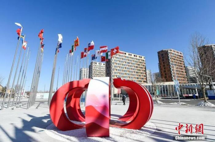 迎风飘舞的各国旗帜将北京冬奥村点缀得韵味十足。中新社记者 何蓬磊 摄