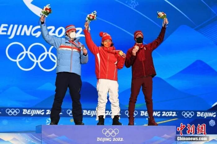 2月15日,在首钢滑雪大跳台举行的北京2022年冬奥会单板滑雪男子大跳台决赛中,中国选手苏翊鸣(中)获得冠军,挪威选手蒙斯·勒伊斯韦兰(左)获得亚军,加拿大选手马克斯·帕罗特(右)获得季军。图为颁奖仪式。中新社记者 李骏 摄
