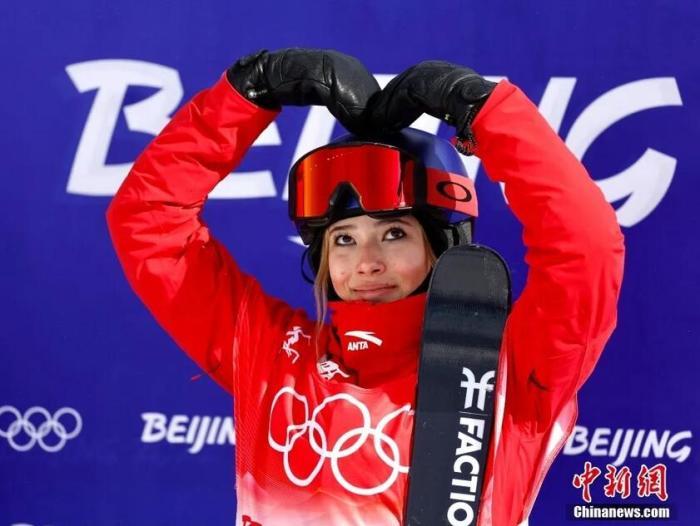 2月15日,北京2022年冬奥会自由式滑雪女子坡面障碍技巧决赛在张家口云顶滑雪公园举行。中国队选手谷爱凌获得银牌。图为谷爱凌在比赛后“比心”。中新社记者 富田 摄