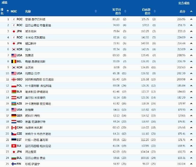 北京时间2月17日晚,2022北京冬奥会花样滑冰女子单人滑自由滑在首都体育馆战罢。短节目排名第二的俄罗斯选手谢尔巴科娃以255.95分获得金牌,为俄罗斯实现冬奥会该项目的三连冠,另一位俄罗斯选手特鲁索娃获得银牌,日本选手坂本花织获得铜牌。短节目排名第一的俄罗斯选手瓦利耶娃发挥失常,仅排名第四。