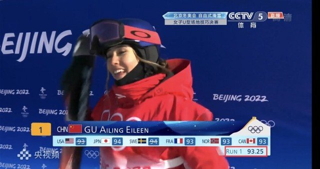 第一轮比赛中,谷爱凌拿出了最熟悉和最有把握的900+双540动作,第一个动作右转900,第二个动作左转900,第三个动作右转720,最终首轮拿到93.75分。