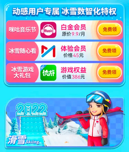 20年后的今天,动感地带依然初心不改,助力实现“三亿人参与冰雪运动”的目标从愿景照进现实,用趣味的线上冰雪体验、丰富的福利开启了动感地带冰雪嘉年华。在中国移动5G云游戏的加持下,动感地带为Z世代用户特别准备了诸多冰雪数智化特权,可谓诚意满满。在中国移动APP、各省掌厅等进入“移起助力 中国冰雪”活动页动感地带品牌专区,准备了干货多多的冰雪游戏大礼包。动感地带俱乐部客户、全球通银卡及以上客户、全家享套餐客户同时订购手机、电视观赛包可享0元优惠价,还为动感地带用户提供游戏互动奖励、数智化特权、冰雪运动特权等权益。