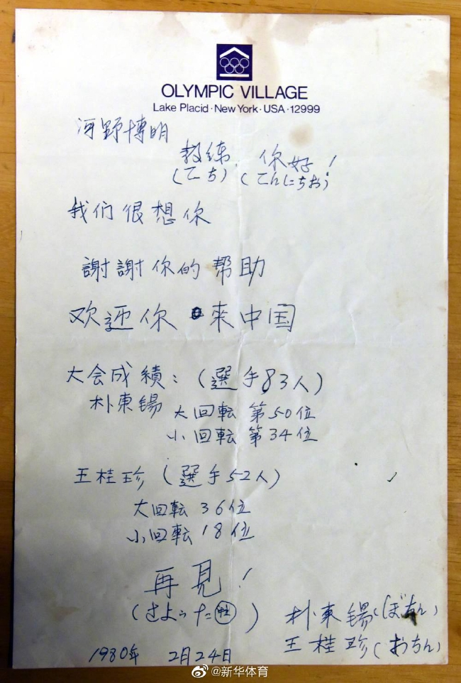 新华社日本野泽2月18日电题:请回答,1980:中国弟子与日本教练尘封的冬奥往事 新华社记者王子江、杨汀、杨光 1980年3月的一天,住在日本长野县野泽村的滑雪教练河野博明收到了一封来自美国普莱西德湖冬奥村的来信,信写在一张冬奥村便签纸上,信的全文内容是这样的: 河野博明教练,你好!我们很想你,谢谢你的帮助,欢迎你来中国。大会成绩(选手83人):朴东锡大回转第50位,小回转第34位。王桂珍(选手52人)大回转36位(注:最终官方成绩是51名选手第35位),小回转18位。再见。 信的最后是朴东锡和王桂珍两人的名字,时间是1980年2月24日。