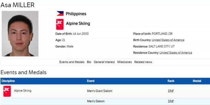 唯一一位代表菲律宾参赛的选手,是高山滑雪运动员阿萨・米勒。他就读于美国盐湖城威斯敏斯特学院经济学专业。他参加了北京冬奥会高山滑雪男子回转和男子大回转的比赛,但都没能完赛。