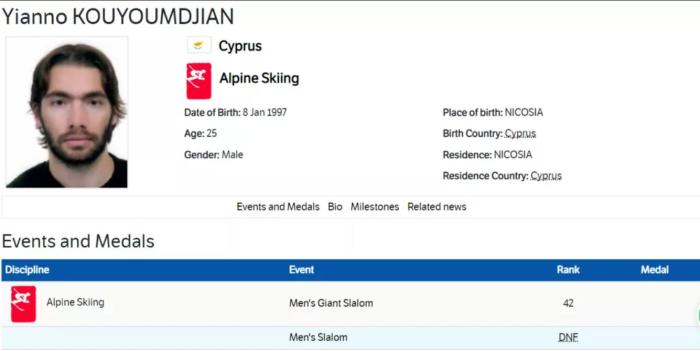 高山滑雪运动员扬诺·古永简,是塞浦路斯唯一一名出战北京冬奥会的运动员。在他所参加的高山滑雪男子大回转比赛中,他位列第42,而在男子回转比赛中未能完赛。