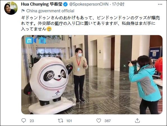 2月19日晚,中国外交部发言人华春莹在推特上用日语发布推文,感谢“义墩墩”在北京冬奥会期间的有趣报道。