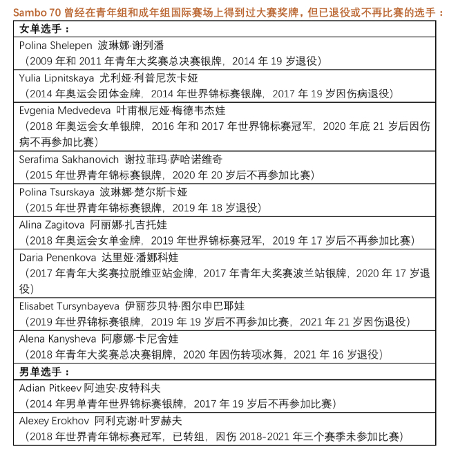 发育对于普通人是青春期的一部分,但是对于不少体操、跳水、花样滑冰的女性运动员来说,就像噩运的倒计时出现了一样。这些是对身体控制要求非常高的项目,而女性体格从小女孩长成成年女性时,身体的结构、肌肉的状态、重心等等都会有很大的变化,所以在发育之后,很多之前会的技术和动作都会遇到困难,有时几乎是要把所有动作全部重新学一遍。即使是少年成名的选手,很多人经过发育关之后,技术上也会变得平平无奇,甚至就此泯然众人,黯然退出竞技舞台。所以Sambo 70对发育关的基本应对方式就是:趁着发育之前赶紧拿成绩,然后就赶紧退役吧。