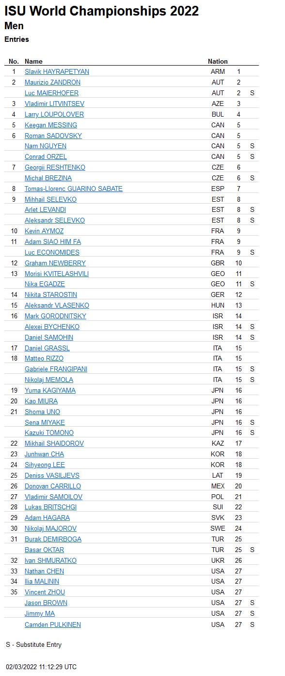 北京时间3月2日,国际滑联官网公布了2022花样滑冰世锦赛的参赛名单。北京冬奥会冰舞金牌得主、法国组合帕帕达吉斯/西泽龙,男子单人滑前三名以及周知方等都将参赛。