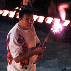 1996年,亚特兰大奥运会开幕式上,阿里行动迟缓,但是当他用颤抖的双手缓缓点燃主火炬的那一瞬间,全世界为之震撼,他用坚毅的表情和眼神告诉人们,他依然是主宰自己命运的斗士。