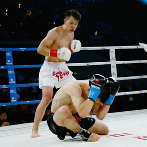 重新站起来后,赵子祥得理不饶人,进行了追击,前田第二次被右摆拳击倒,裁判遂判罚了TKO。
