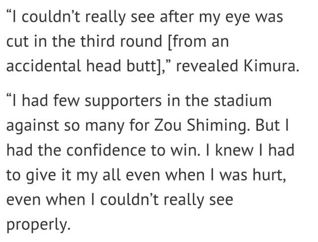 木村翔坦言,他根本没有想到自己会赢,而他这场胜利也被日本媒体誉为日本拳手创造的史上最大冷门,他表示,“比赛第三回合,我的右眼被撞开了一道口子,流下的血让我的视线受阻。在整个体育馆里,为我加油的人寥寥无几,全都是清一色为邹市明呼喊,但我一直在用信念支撑着自己。我对自己说,必须使出全部的力量拿下比赛。”