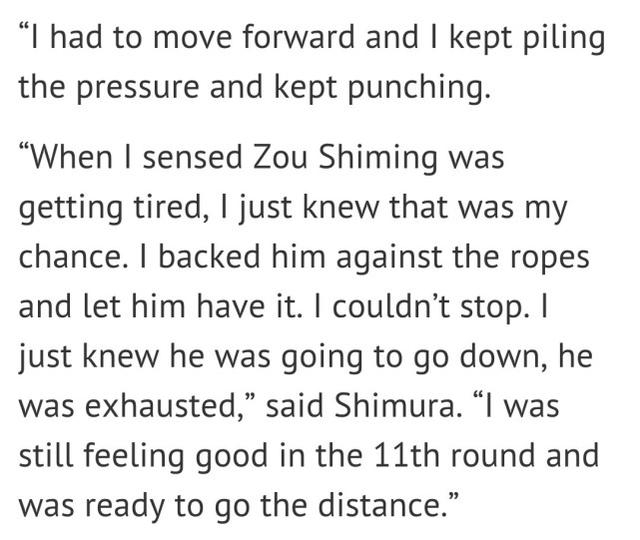 木村翔指出,他获胜的秘诀就是不断的进攻,不断的给邹市明施压,“我不得不向前推进,给邹市明制造压力。当我察觉到邹市明体能下滑的时候,我就知道机会来了。我把他堵在围绳处,不让他到处跑,然后我持续施加组合拳,他已经筋疲力尽了,我知道他会倒地的。说实话,我在第11回合仍然保持着不错的体能,我也做好了和他打满12回合的准备。”
