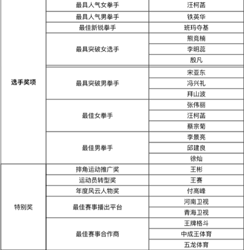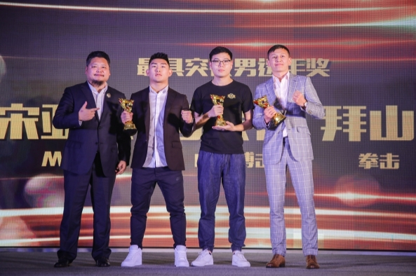 其他奖项方面,“小虎”铁英华斩获“最具人气男拳手”,ONE冠军赛金腰带得主“熊猫”熊竞楠斩获“最具突破女拳手”,“功夫猴子”宋亚东、“中国GGG”拜山波斩获“最具突破男拳手”,“中国WWE第一人”王彬获得了“摔角运动推广奖”。