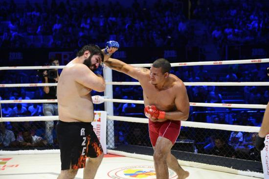 整场比赛给拳迷带来视觉最为震撼的一场,便是这场巨兽之战,由于重量级选手拥有一锤定音的重击能力,所以两个人打的非常谨慎,抱架严密,在经过试探后,两个人逐渐打出了火气,巴西“老虎”罗杰斯·索萨由于身高臂展优势,在站立对轰拳法的时候逐渐占据了上风,回合结束的时候,阿塞拜疆选手邵尔·哈吉巴巴耶夫逐渐找回一些优势,连续的左右摆拳差点终结对手。