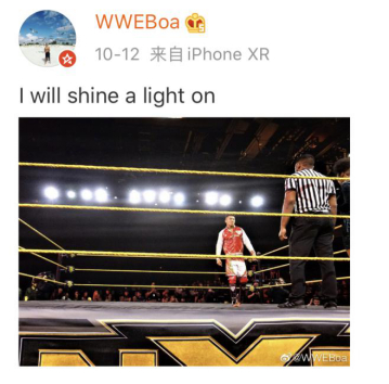 前不久,WWE NXT的舞台上出现了中国之星Boa(王彦博)的身影,这也是他首次登上NXT美国电视直播首秀。在首支个人宣传片中,Boa激动地表示:“从来到WWE训练中心的第一天起,我就在为这一刻做着准备。作为NXT选手,我代表的是我的祖国中国,我要告诉WWE和NXT的所有粉丝,我是Boa,王彦博”。