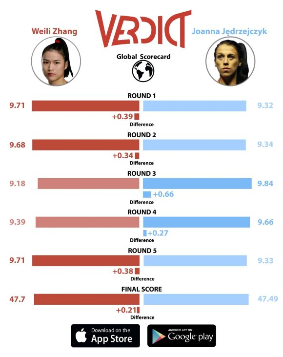 比赛的最后比分是2比1分歧判定,3名裁判的打分是2个48比47、1个47比48。这是能够分出胜负的最小差距,比赛打得很精彩焦灼,时后在国际社交媒体上得到了广泛的议论。