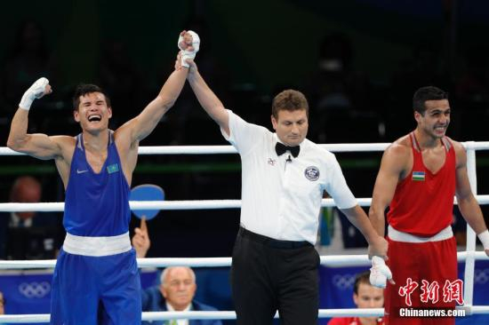 资料图:2016里约奥运会男子拳击69公斤级决赛在里约会展中心6号馆举行,哈萨克斯坦选手耶里希诺夫(蓝)战胜乌兹别克斯坦选手吉亚索瓦,夺得金牌。中新网记者 盛佳鹏 摄