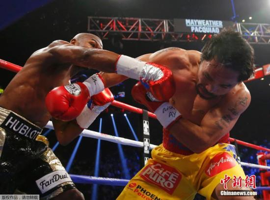 资料图:世界拳坛世纪之战在美国拉斯维加斯展开,38岁WBC/WBA次中量级拳王梅威瑟对阵36岁WBO次中量级拳王帕奎奥,最终通过12回合激战,梅威瑟点数获胜,拿下“世纪之战”的胜利。