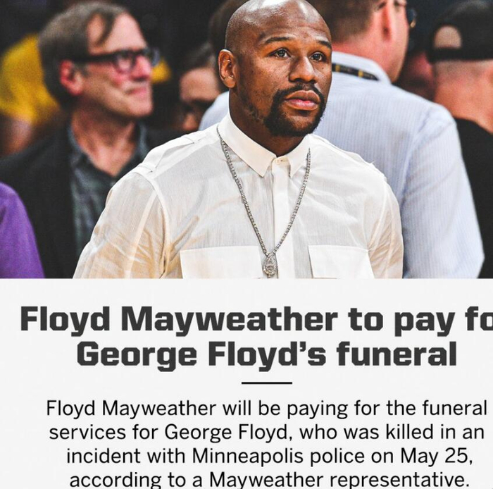 最新消息显示,传奇拳王梅威瑟已经和弗洛伊德的家人取得了联系,并承诺支付弗洛伊德葬礼所需要的全部费用。