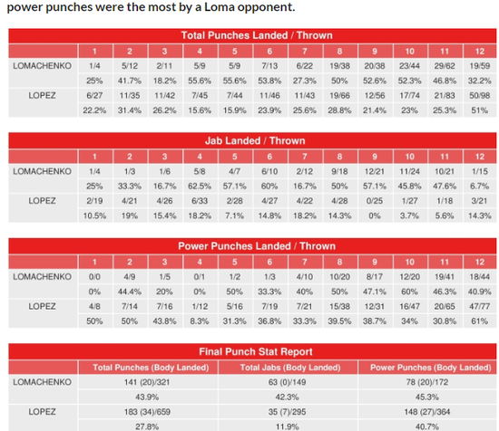 根据一直备受争议的拳击统计数据,全场洛马琴科出拳只有321次,打中了141拳,而洛佩兹则是打了659拳命中了183下。