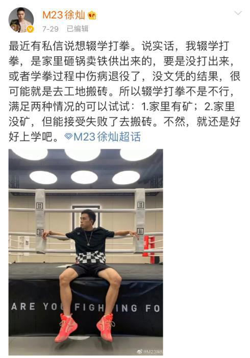 7月份,徐灿发了一条微博,说有人私信跟他说想辍学打拳,但徐灿认为最好不要轻易做这个决定,因为万一没能打出名堂或者受了伤,今后的生活可能会比较艰难。