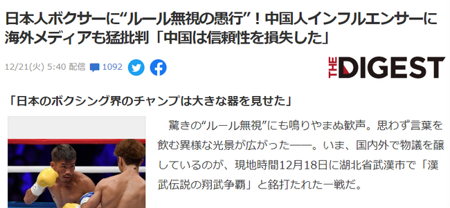 21日早上5点, THE DIGEST发了第二篇文章,标题是《对日本拳手做出蠢行的中国人依旧胡说八道 无视比赛合同规则后竟然说 需要规则么?》。