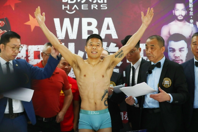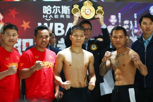 3月15日,在浙江永康体育馆,参加哈尔斯 WBA拳王争霸赛比赛的6对拳手,一一进行了赛前称重和规则讲解。