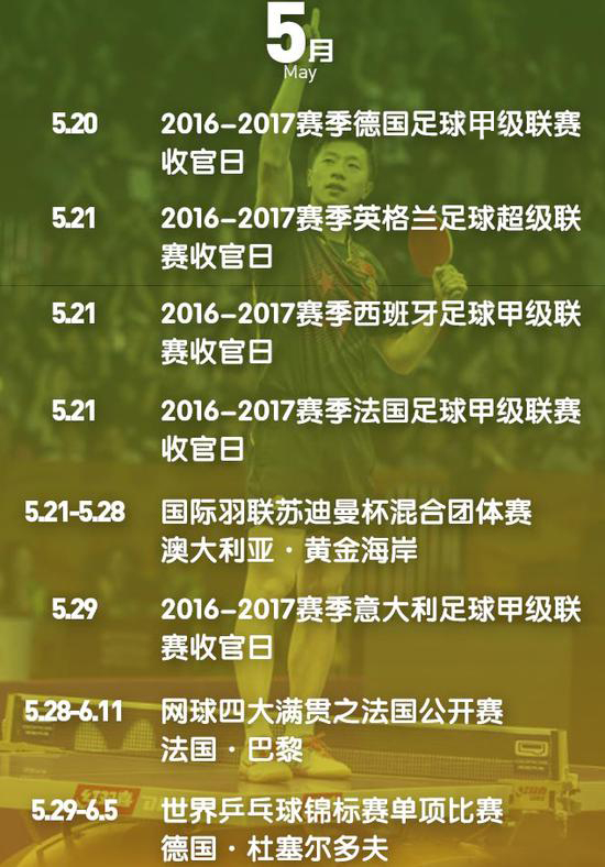 5月是赛事密集的一个月份,羽毛球苏迪曼杯将在澳大利亚上演,新老交替中的国羽能有怎样的表现呢?能否守住这份荣耀吗?欧洲足球联赛相继收官,意甲、英超、西甲、德甲、法甲冠军将产生最后的拥有者,此外欧联杯决赛也将上演。月底,本赛季第二项大满贯赛事法网也将在罗兰-加洛斯上演,纳达尔能王者归来吗?